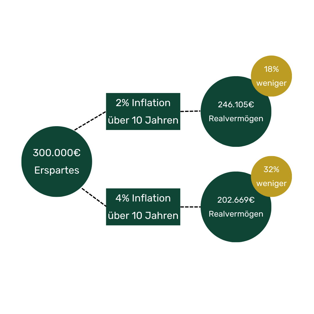 300.000 € heute haben bei steigenden Preisen eine deutlich geringere Kaufkraft in der Zukunft. In 10 Jahren entsprechen 300.000 € bei durchschnittlich 2 % Inflation nur noch etwa 246.000 € und bei 4 % Inflation nur rund 202.000 €. Hier ein Überblick: